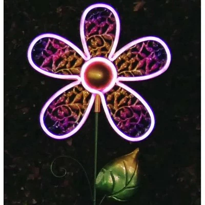 The Ultimate Innovations Neon Light Garden Stake shows a beautiful garden friend during the day and then provides a stunning neon light outline at night! Each of the stakes is outlined with neon tubing that is solar powered for a burst of vibrant color when the sun goes down. During the day each features a colorful powder coated filigree design that brings each of these adorable figures to life. A burst of color for any lawn or garden! Color may vary.