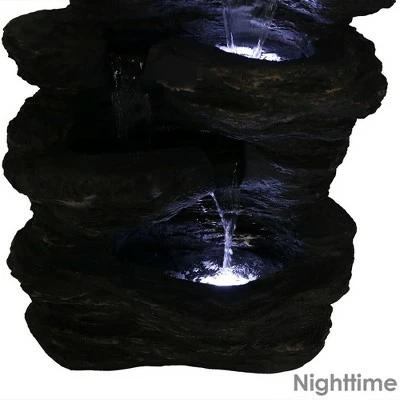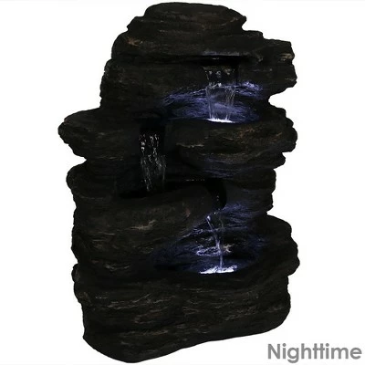 Add an extra natural element to the garden, in the yard, or on the patio with this large rocky outdoor waterfall fountain. Features like this one makes it easy to capture the beauty, and soothing aspects of a natural waterfall. Expert detailing and a realistic appearance, this rock waterfall fountain will be a focal point in any landscaped area for many seasons to come. The polystone material it is made from is more durable and heavier than resin or fiberglass but still much lighter than the concrete or stone fountains. It has a porcelain like feel to the touch, and an incredible ability to capture the most minute detail. Images include product in nighttime environment.
