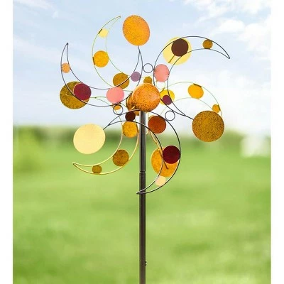 Bring the heavens down to Earth when you display this unique Abstract Crescent Moon and Planets Wind Spinner. A delightful example of kinetic sculptural art, this dazzling spinner features two independently-turning rotors, each with three crescent moons. Each moon is filled with bright metal discs suggesting planets and a larger metal disc at the tip of each crescent shape. Painted in a variety of weathered metallic colors, each element will catch the light and sparkle in the sunshine. A four-pronged metal stake ensures secure installation in your garden..