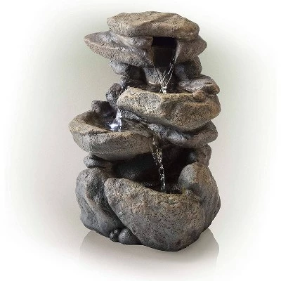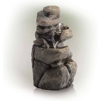 Unplug from the day and meditate to the sound of flowing water with the Alpine Corporation 11″ Tall Indoor 3-Tier Tabletop Stone Water Fountain. This modern Zen tabletop-style fountain statue provides a tranquil and soothing addition to your porch or patio. Constructed from durable resin, stone powder, and fiberglass, the fountain is weatherproof, rust-resistant, and resilient and can be used in your home’s interior dΓ©cor or outside. This unique and versatile dΓ©cor piece will provide a tranquil and soothing addition to your homeβs backyard or indoor dΓ©cor. Evoking a traditional Zen garden, the fountain has a natural aged stone appearance that becomes illuminated with the LED lights. Relax to the sounds of the calming natural water flow as it trickles down from the top tier of the fountain. Not only will the fountain provide you with a sense of serenity, it will also attract birds to your outdoor area, which in turn promotes healthy gardens. This updated take on the classic fountain is an elegant addition to your courtyard, patio, or yard, and gives your garden or tabletop visual interest with its natural waterfall style. For quick install and convenient operating, the fountain includes all necessary parts to begin creating an outdoor oasis. This fountain measures 7″L x 6″W x 11″H to fit almost any indoor or outdoor table space and includes a one-year manufacturer’s warranty from date of purchase.