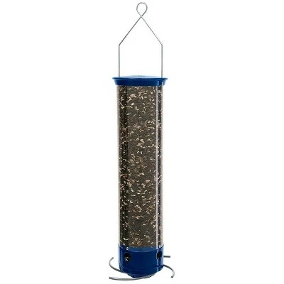 Keep squirrels away from your bird feeder and save seed! The 5 pound capacity Droll Yankees Yankee Whipper Bird Feeder is a weight sensitive collapsing curved perch feeder that supports birds and not squirrels. It allows the birds to eat and saves seed by keeping squirrels away. The Yankee Whipper Bird Feeder has four specially calibrated curved perches that allow birds of all sizes to feed, but collapse under the weight of a squirrel. The clear 17β UV stabilized polycarbonate seed tube is too long and large in circumference for squirrels to navigate. It will hold 5 pounds of seed that is only accessible from the four perches. The clear polycarbonate helps you keep track of seed levels. A heavy, snug fitting cap sits firmly in place atop the feeder and can only be lifted by humans, not squirrels. The Whipperβs metal parts are powder coated in a lovely evening blue that will resist chipping and fading. Hanging is a cinch with the sturdy stainless steel looped hanging wire. Backed by Droll Yankees Lifetime Warranty against squirrel damage.