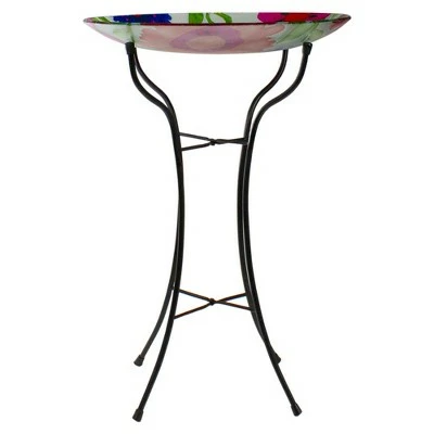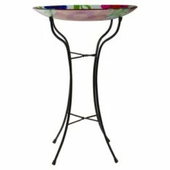 A delightful glass bird bath feeder is sure to add a splash of color to your garden. This birdbath feeder in pink will make your garden spaces more lively. Quality materials are used to ensure that it lasts for years to come.Product Features:Hand painted glass bird bath feederRed and blue summer flowers Glass dish sits atop a black finished metal stand and can be filled with water or birdseedPerfect accent to add a splash of color to the garden Dimensions: 25.75″ high x 18″ diameterMaterial(s): glass/metal