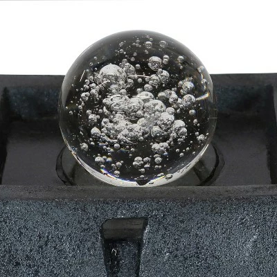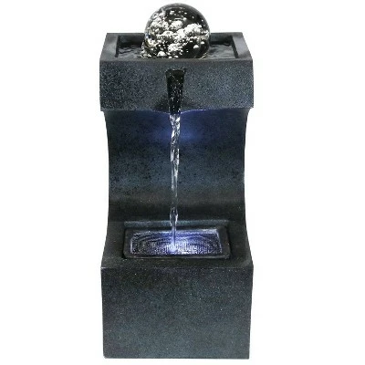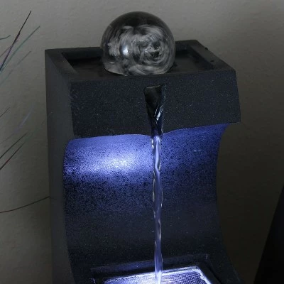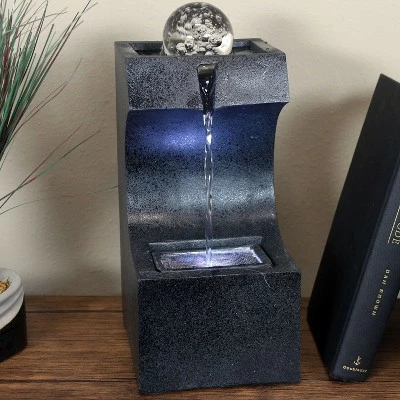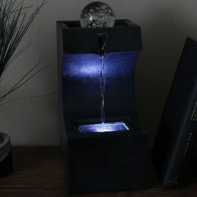 This contemporary little water fountain will add soothing ambiance to any indoor space. It’s a lovely decorative accent for the bedroom, office, living room or kitchen. Water bubbles from the top and flows through the spout and into the lower basin where it recirculates through the submersible electric pump. The fountain features a durable polyresin construction and comes with a pump and LED light for the basin. Images include product in nighttime environment.