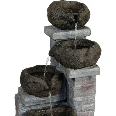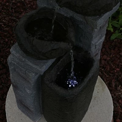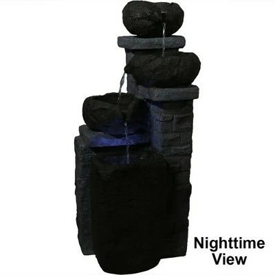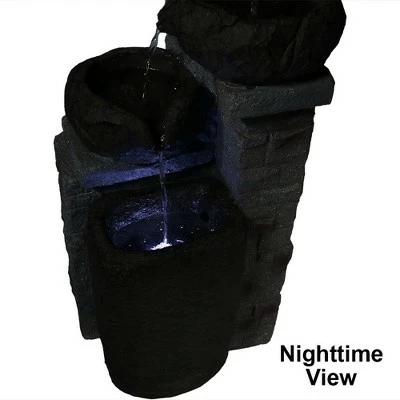 Make a large statement with little effort by adding this natural carved fountain to any outdoor space! The various shades of brown and grey bring out the feel of the feature as the LED lighting illuminates the flowing water. The soothing peaceful sounds of water cascading down will create a relaxing atmospheres. As the water flows from the top bowl down to the bottom bowl, the solar pump helps the water to recirculate back to the top for hours of outdoor enjoyment. If fully charged, the batteries will power the fountain for up to 4 hours. When the batteries are depleted, the system will automatically switch to be powered by the solar panel, and the fountain will resume running when the sun comes out. Images include product in nighttime environment.