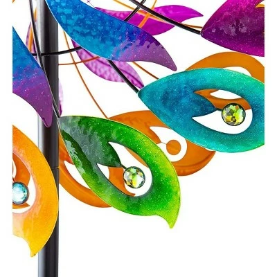 Even a gentle breeze sets this dynamic metal Feather Spiral Spinner in motion. Two large rotors are formed from multi-colored feathers with a faceted plastic “jewel” at center that sparkles in the sunlight. Two smaller blue and purple rotors sit at the center of each side. All four rotors turn independently so the show will be dazzling every time. At two feet in diameter and more than six feet tall, this colorful twirler will not go unnoticed! Sturdy metal stakes ensure secure installation in your garden.