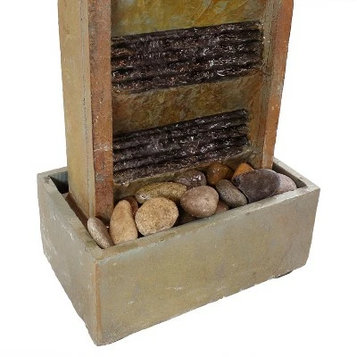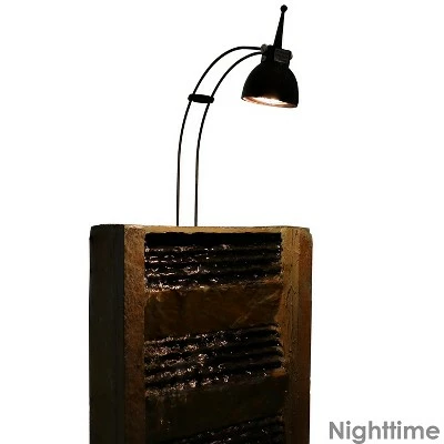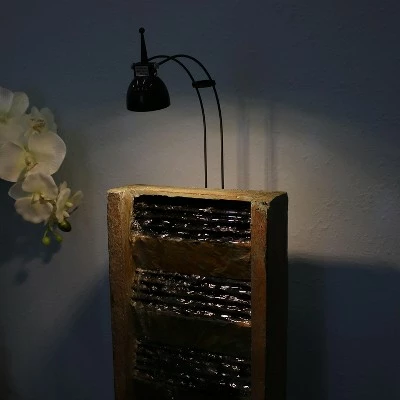 Enjoy pure relaxation during the day and turn off stress at night next to the soothing water sounds of the tranquility fountain. Turning on this slate fountain’s LED light will accent the beauty of the fountain instantly. Admire its beauty during any time of day, and impress guests with this elegant display of tranquility and peace while listening to its calm trickling sounds of lightly falling water. This water fountain is sure to bring warmth and welcoming to any room in the house. Even better, assembly is easy and no plumbing is required. Simply plug the fountain into a standard outdoor electrical outlet once it has been assembled and filled with water. Images include product in nighttime environment.