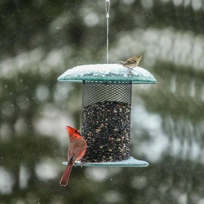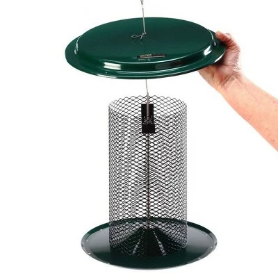 Magnet mesh sunflower feeder. All-steel construction and polyester powder coated. Center seed diverter, drainage holes in base, easy to fill and clean. Dispense sunflower, peanuts or a blend of seed. Comes with a lifetime guarantee. Available in green top and bottom with black screen. It holds 5-quarts. Measures 12-1/2-inch width by 12-inch height with hanging cable of 19-1/2-inch height.