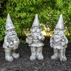 Gnomes are best known for guarding Earthly treasures and providing good luck, making them perfect for protecting your garden! This trio is ready to help with a plant, shovel and watering can. Made from durable materials, these gnomes will be tending your garden for years and years.Trio of gardening gnomes outdoor statuesMade to look like real stoneSet can not be split upDimensions: 13.25″ x 5.25″W x 6″DMaterial(s): polyresinNote:Set includes 1 of each item shown