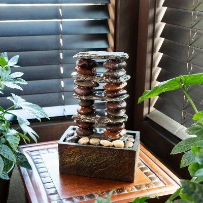 - CASCADING TABLETOP FOUNTAIN: Contemporary design with natural aged stone look and river stones