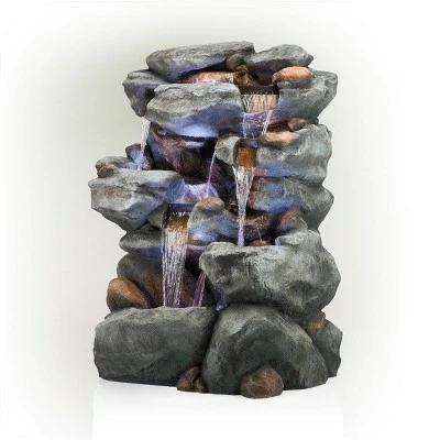 Unplug from the day and meditate to the sound of flowing water with Alpine’s 54″” tall Indoor/Outdoor Waterfall Rock Fountain with LED lights. This relaxing floor fountain statue provides a tranquil and soothing addition to your yard, porch, or patio and even inside your home. Constructed from durable polystone and fiberglass, the fountain is weatherproof, rust-resistant, and resilient for use in your home’s interior décor or outside. This unique and versatile décor piece includes LED lights for a tranquil and soothing addition to your home’s backyard or indoor décor. Replicating a rainforest scene, the fountain has a natural appearance and realistic stone textures. Relax to the sounds of the calming natural water flow as it trickles down through the rocks. For quick installation and convenient operating, the fountain includes all necessary parts, including a pump, to begin creating an outdoor oasis. This fountain measures 38″L x 27″W x 54″H to fit almost any indoor or outdoor space and includes a one-year manufacturer’s warranty from date of purchase.