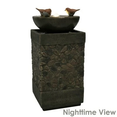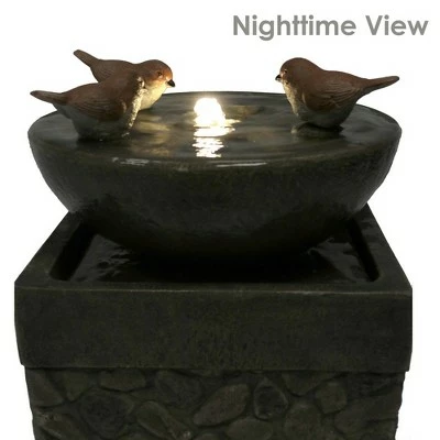 Catch the attention of both house guests and nearby birds with this contemporary style outdoor birdbath fountain that is perfect for the patio, deck, or in the garden. This water fountain is constructed from polyresin; its bowl has been formed to resemble stone and its base is designed to resemble a “pebble-encrusted” look. The three playful birds add extra charm and amusement to the fountain. The LED light located in the bowl illuminates the water that lifts from the fountain, giving it a beautiful glow. No plumbing is required, simply plug the pump’s transformer into an electrical outlet after the fountain has been assembled, filled, and ready to run. Images include product in nighttime environment.