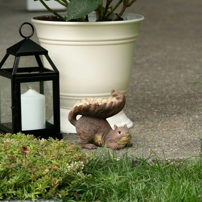 - A plump brown squirrel shares his bounty with his feathered pals, cupping a generous serving of birdseed in his fluffy tail. Lifelike feeder is a lovable outdoor accent!