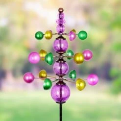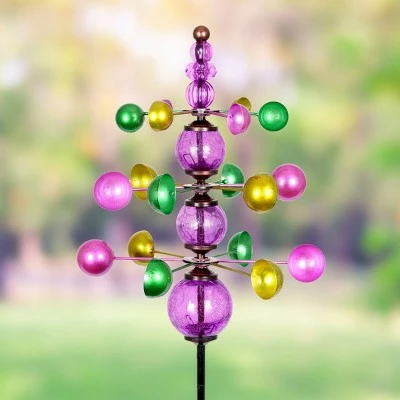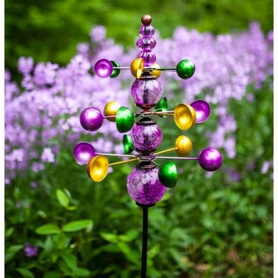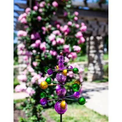 Beautiful three tiered spinning garden art adds a burst of color and life to your garden. Purple glass crackle balls add an elegant anchoring detail as the hand-painted, multicolored layers spin in the breeze. Makes a beautiful kinetic gift for the garden enthusiast.