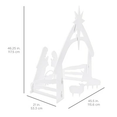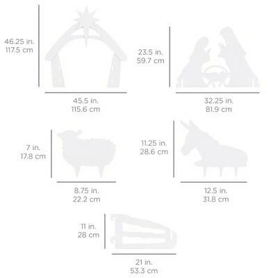 Bring home the magic of a classic tale with bright colors and a versatile, lightweight design! This decorative set is eye-catching and meaningful, a perfect addition to your front yard, back yard, or church! Freely display figures in front or behind the manger for an attractive, finished look. (Experience a front design or a back design)The adjustable stickers add depth and color while complementing the Christmas pallette. A durable design combined with quality materials resists the harsh winter months. The thick (0.5in) PVC is rain resistant, wind resistant, and snow resistant; the material adds to the stable design by allowing all components to withstand the harsh elements. Add to all these qualities an easy assembly and you have a winner: simply interlock the figures and stands, arrange and enjoy! This beautiful silhouette is the perfect way to celebrate Christmas with an easy setup and breakdown for your convenience. Product Specifications: Manger Dimensions (46.25in x 45.5in or 117.5cm x 115.6cm), Family Dimensions (23.5in x 32.25in or 59.7cm x 81.9cm), Sheep (7in x 8.75in or 17.8cm x 2.2cm), Donkey (11.25in x 12.5in or 28.6cm x 31.8cm), Stand (11in x 21in or 28cm x 53.3cm)
