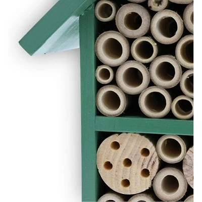 Item DescriptionMason Bee Houses for Garden, Green Bee Hive (7.4 x 10.15 x 4.65 in)MASON BEE HIVE: This bee home is suitable for a wide variety of bee species, including mason bees, carpenter bees, and orchard beesIMPROVE POLLINATION: Healthy beneficial mason bees visit up to 1000 plants a day, this garden bee house is an ideal bee starter hive for attracting mason bees; enjoy an abundance of vegetables and flowers while simultaneously saving the beesDIMENSIONS: Bee hotel measures 7.4 x 10.15 x 4.65 inches and is designed with varying tube diameters to attract different species of beesHIGH QUALITY: Crafted from pine wood to provide a sturdy shelter for your bees while they nest; an ideal alternative to paper or cardboard bee hivesWHATβS INCLUDED: Includes 1 bee hive box; designed to last 1-2 seasonsNative bees are effective pollinators and a gardenβs best friend, this insect hotel will help increase the population of beneficial bees, and is as decorative as it is functional. Easily place this beehive in the garden, patio, tree, fence, or wall. The angled roof will protect bees from harsh weather conditions.Product names are trademark of listed manufacturer or other owners, and are not trademarks of eForCity Corp. The manufacturer does not necessarily endorse use of these products.