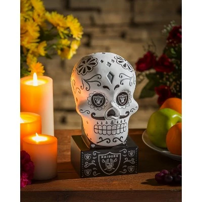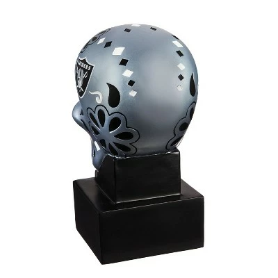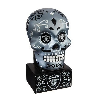 This fully dimensional LAS VEGAS RAIDERS skull garden statue is perfect for any fan’s collection. The hand painted polystone statue features beautiful artwork inspired by Dia de los Muertos sugar skulls.