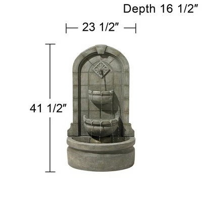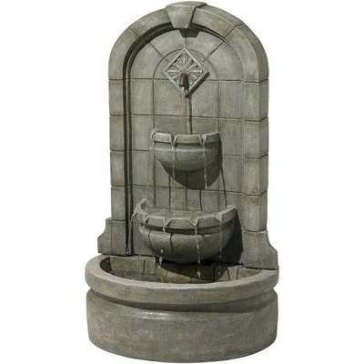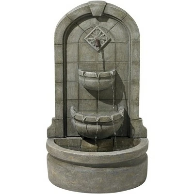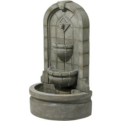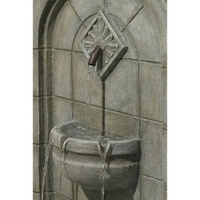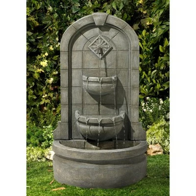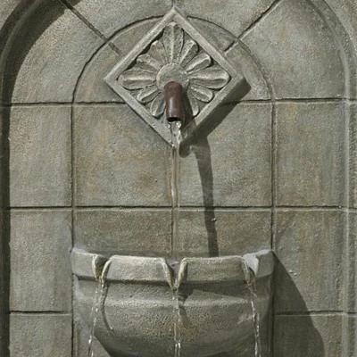 Bring beautiful, classic style to your indoor or outdoor space with the traditional English style of this three tier floor fountain. The design is handsomely structured with an arched back and a tiled cement look. A diamond shaped medallion with a floral motif is home to a bronze finish spigot that releases water into the tiered basins below. A lightweight resin construction makes it easy to position this fountain against the wall before filling it with water.