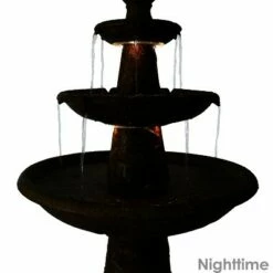 Create instant elegant style in any outdoor setting whether it’s in the garden, on the patio, deck or lawn. The outdoor water fountain features a glazed ceramic construction with unique floral and hummingbird detailing on the side. Water bubbles out of the ornamental top and down the tiers and recirculates through the fountain via a submersible electric pump. No plumbing is required, just plug it in to a standard outdoor electrical outlet when ready to operate. Images include product in nighttime environment.