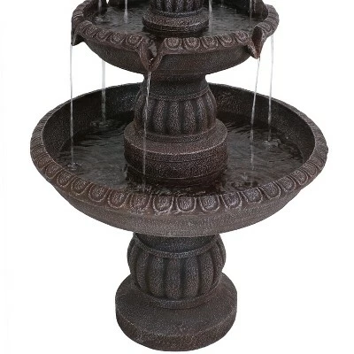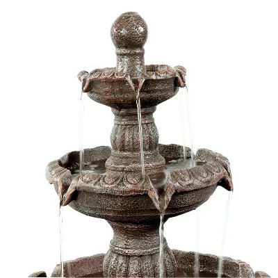 Create a relaxing environment with this 4-Tiered water fountain. Whether placed in a garden, on a patio, deck, or porch, this beauty will shine and please. Plus, the soothing flowing water will add a calming ambiance to any space. The fountain’s largest lower tier has a 27″ diameter and is about 5.5″ deep, the next tier has an 18″ diameter and is about 4.5″ deep, the third has an 11.5″ diameter and is about 3.5″ deep while the top tier has a 7″ diameter and is about 2.5″ deep. No plumbing is required! Once the fountain is assembled and filled, simply plug the cord into a standard outdoor electrical outlet when ready for it to run.