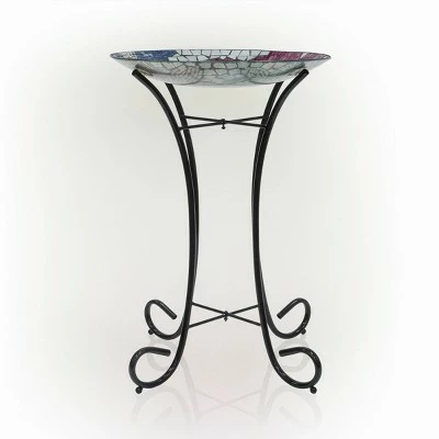 Provide a gathering space in your backyard for your feathered friends with the Alpine Corporation 24″ tall Outdoor Floral Glass Birdbath Bowl with Metal Stand. This modern birdbath bowl with touches of metallic mosaic glass provides a sanctuary for all types of birds, while adding floral, mosaic style to your outdoor living space, yard, or lawn. Skillfully crafted from sturdy and resilient glass with an included metal stand, the 2″ tall bird bowl is built for years of quality outdoor use. The sturdy and supportive legs provide stability for the bird bowl and prevents it from tipping over when multiple birds congregate on the basinβs wide, shallow bowl. Not only is the birdbath functional, itβs stylish as well and provides an elegant addition to your courtyard, patio, or yard. It will give your garden visual interest with its timeless design and artistic style. This compact, birdbath measures 18″L x 18″W x 2″H and the included stand measures 17″L x 17″W x 23″H (total height is 24″) to fit almost any outdoor area and includes a one-year manufacturer’s warranty from date of purchase. Alpine Corporation is one of America’s leading designers, importers, and distributors of superior quality home and garden decor products. Alpine’s award winning in-house design team continuously develops new and innovative “statement pieces” for your home and garden. Your outdoor living spaces will be the envy of the neighborhood with our wide assortment of fresh, fashionable and contemporary products, from beautifully crafted solar garden stakes featuring patented motion and fiber optic lighting technology to gorgeous glass and glow-in-the-dark birdbaths and feeders.
