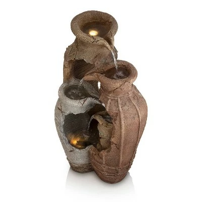 Unplug from the day and meditate to the sound of flowing water with the Alpine Corporation Distressed Garden Pot Fountain. The design adds a Zen look, while the relaxing, gentle water falling helps to bring in a natural element. This outdoor fountain looks great in your garden, patio, deck, porch, or yard space. The fiberglass construction is weather-proof, rust-resistant, and durable for years of quality use. The weight of the fountain and sturdy base allow it to stay upright in the strongest wind. To use, simply plug in to an outdoor outlet, fill upper level with water, and watch as the interior pump creates a lovely water flow. With a 1-year warranty, you can be confident in the quality of your purchase. Integrated Halogen lights illuminate the fountain for added ambiance. Fountain measures 23″L x 18″W x 39″H for use in yards of any size.