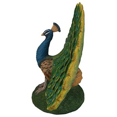 Knowing that Mother Nature pulled out all the stops when designing the peacock, this Design Toscano exclusive does its best to mirror the peacock s actual feathers that each house microscopic, light-reflecting, crystal-like structures. Fanning a showy, two-foot wide, panoramic plumage of emerald green, tantalizing teal and cobalt blue feathers, our own peacock statue makes an absolute show-stopping outdoor centerpiece. Cast in quality designer resin from cockscomb to tail feathers, this aviary animal statue is hand painted in jewel tones that ensure your garden won t soon be forgotten.
