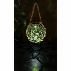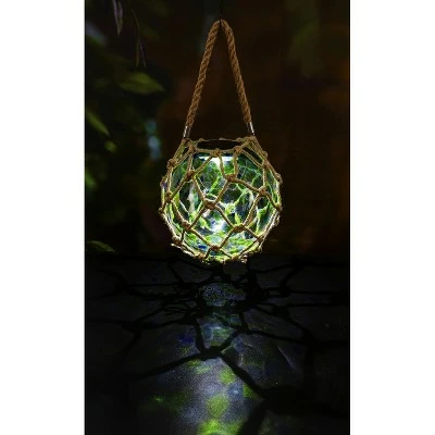 Decorate your garden during the day and color it at night with this Solar Art Glass Fishing Float. This design is inspired by fishing floats used by commercial fishing companies in Asia dating back to 1950. Its vintage look features a glass ball wrapped in rope with a green and blue speckled design that glows in the night after absorbing sunlight during the day. This piece is made of durable high-quality glass, fiber, and durable plastic, making it outdoor-safe and weather-resistant. The design can be displayed indoors or outdoors, but place the fishing float in direct sunlight for best results. The solar-powered design requires 6-8 hours in direct sunlight for a full charge to illuminate throughout the night. Requires 1x AA Ni-MH battery, which is included. The hanging height is approximately 16 inches.