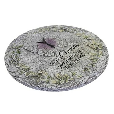 Pretty Gray Rock-Textured Stepping Stone Embellished In The Middle With A Purple Butterfly And Circled In Calla Lilies.. New. Comes Packaged In A Box.. Measurements 11.5 In H X 11.5 In W X .5 In D. . Made Of Polyresin. No Assembly Required. Indoor Or Outdoor Use. Imported