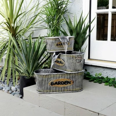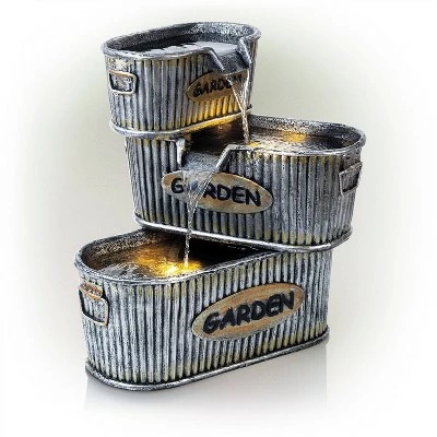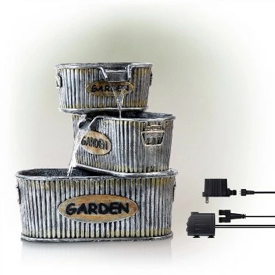 Add a classic Americana feel to your home and outdoor dรฉcor with Alpineโs 20″ tall Old-Fashioned Outdoor 3-Tier Washtub Garden Fountain Yard Art Dรฉcor. This classic fountain statue will provide a rustic addition to your outdoor living space. Constructed from durable, weather-resistant polyresin and stone powder, this unique lawn statue will provide a tranquil and soothing addition to your backyard. Featuring three “Garden” faux tin tubs, the fountain constantly circulates water down from the top barrel to the bottom. Relax to the sounds of the soft, natural water flow as it streams down. Not only will the fountain add a playful decoration to your yard, it will also attract birds to your outdoor area. This classic and charming floor fountain is a great addition to your courtyard, patio, or yard. For quick install and convenient operating, the fountain includes all necessary parts, as well as a built-in pump, to begin creating an outdoor oasis. This standing fountain measures 19″L x 16″W x 20″H and includes a one-year manufacturer’s warranty from date of purchase.