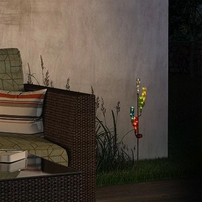 Light up your evening gardens with fun and vibrant decors like this glass bottle candelabra stake. This decor features a set of colorful inverted glass bottles on a candelabra stake fashioned with solar-powered warm white LED string lights that last up to 6 hours on one full charge. It adds a great ambient feel to your outdoor evening setting in any given season. It’s perfect for pathways and as accent decors to your vibrant garden life, creating a stunning outdoor display.