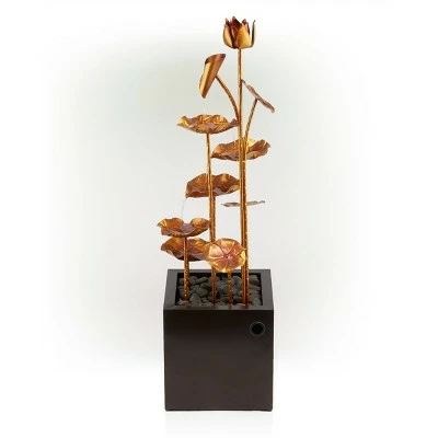 - BEAUTIFUL DESIGN: Copper-colored leaves that elegantly cascade water down to the river rocks in the modern base create a look that is stylish with any decor
