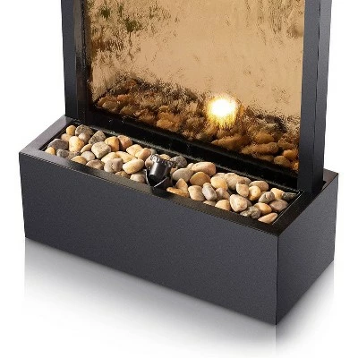 Bring the beauty of nature into your home with the Alpine Corporation Bronze Mirror Waterfall Fountain. Modern interpretations of natureβs wonders give your home a clean, contemporary look while creating a relaxing ambiance. The combination of on-trend design mixed with natural stone elements gives a sleek look to your indoor or outdoor decor. Watch as water falls from the top of the mirror to the bottom basin, bringing the beauty of the outdoors to your space. Included river rocks can be arranged in the top of the basin, enhancing the rustic character of the fountain. With an included halogen light, you can illuminate the trickling water for a subtle yet beautiful light source. The slim design allows you to place it against a wall for a statement piece that doesn’t get in the way. To use, simply plug into an outlet, fill lower basin with water, and watch as the interior pump creates a lovely vertical water flow. With a 1-year warranty, you can be confident in the quality of your purchase. Fountain measures 24″L x 10″W x 72″H for a perfect fit in your office, bedroom, living room, hall, kitchen, and more.