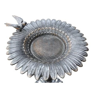 While you wait for your garden to bloom, just add this Sunflower Birdbath from Antique Pewter for a flower that’s here to stay. The base is made of a root design that is both innovative and functional. This metal birdbath comes with cute critters climbing over the post and base, and a bird standing on the petals that’s sure to gather interest from real birds. Our sunflower bird bath in silver is the perfect addition to any setting, bringing beauty and style to your outdoor patio, backyard, or garden. With a rust-free cast aluminum frame and base this bird bath will last for many years in all weather conditions. This piece also features a powder coated finish that is very durable for the outdoor setting. Minimal assembly is needed for this item, making it a perfect gift for any friends or family.