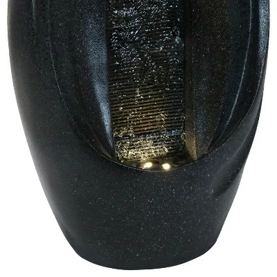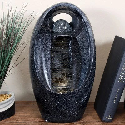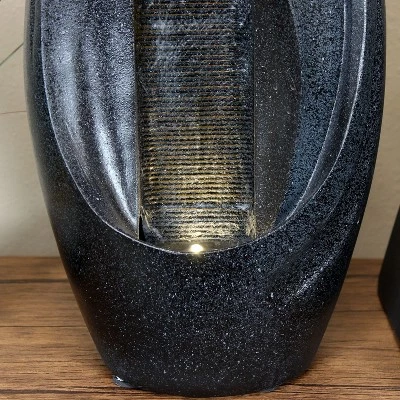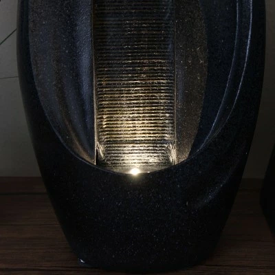 This Zen-inspired oval tabletop water fountain will bring an instant feeling of calm with its modern design. Featuring a polyresin construction and included submersible pump and LED light, this fountain comes ready to use. Water flows over the rippled face and down to the basin where it recirculates through the fountain. Images include product in nighttime environment.
