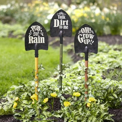 - Each shovel features a funny gardening pun