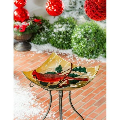 This stunning bird bath features hand painted artwork of an elegant cardinal perched on a holly branch.