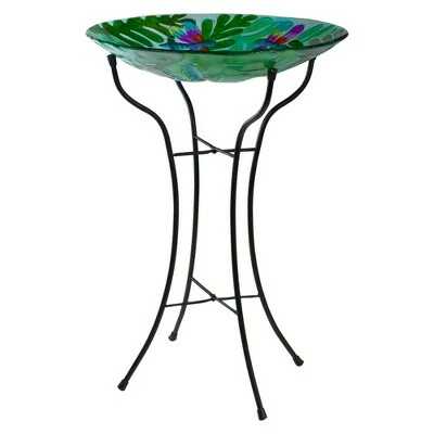 A delightful glass bird bath feeder is sure to add a splash of color to your garden. This vibrantly colored birdbath feeder will make your garden spaces more lively. Quality materials are used to ensure that it lasts for years to come.Product Features:Bird bath features colorful images of dragonflies with green leavesGlass can be placed atop a metal stand and can be filled with water or birdseedPerfect accent to add a splash of color to your garden Recommended for both indoor and outdoor useDimensions: 25.75″ high x 18″ in diameter Material(s): glass/metal