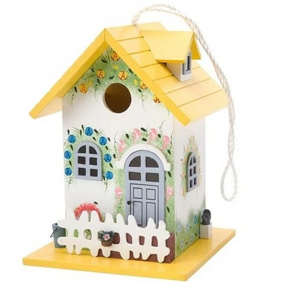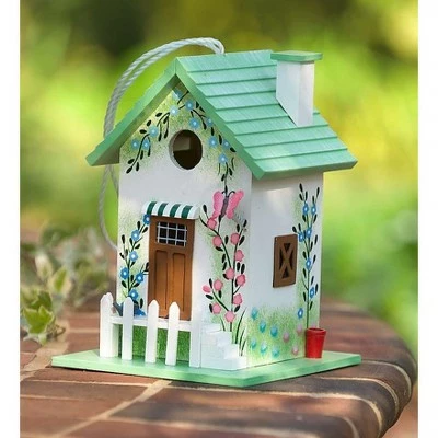 You’ll love this Cottage Birdhouse as much as the birds do! Our decorative yet fully functional birdhouse is ready for outdoor use with wood construction, outdoor safe paint and charming weatherproof resin details. Removable back door for easy cleaning. Post mount it or hang it from the attached sturdy nylon cord.