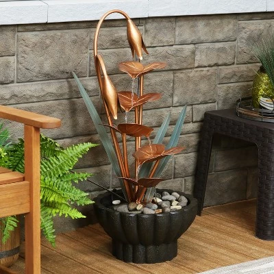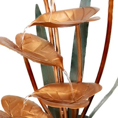 Welcome guests and family members with this charming copper outdoor fountain featuring delicate flower petals gently dripping water onto garden leaves. The water “tings” off the petals delicately, creating a sound similar to water pouring on a tin roof. With its elegant appearance and light, peaceful water sounds, this outdoor fountain is sure to create a tranquil atmosphere. No plumbing is required, simply plug the cable into a standard electrical outdoor outlet and enjoy!