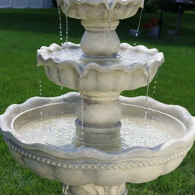 Add classic charm and elegance to any garden, patio, or yard with this beautiful electric fountain. The three tier masterpiece will be a great addition to any outdoor space. Plus, the fountain stands over 4′ so it is sure to impress family and friends as it adds soothing running water sounds to the atmosphere. It also features an electric pump that plugs into a standard electric outlet that allows the water to recirculate from the top tier through the bottom basin and back.