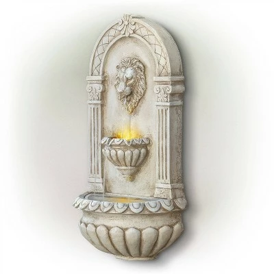 Elevate your home’s outdoor appearance with this elegant 32″ Tall Outdoor Classical Wall-Mounted Water Fountain with Lion Head and LED Lights from Alpine. This fountain wall statue provides a tranquil and soothing addition to your porch, backyard, or sunroom. Constructed from durable resin, stone powder and fiberglass with a classical look, the fountain is weatherproof, rust-resistant, and resilient. This wall-mounted statue will bring a touch of Old World European sophistication to your outdoor space. Replicating an exquisite European Renaissance statue, the fountain becomes illuminated with the included 7 warm white LED lights, and is sure to light up your garden or patio. Relax to the sounds of the soft, natural water flow as it trickles down from the top tier of the fountain to the basin. Not only will the fountain provide you with serenity, it will also add a breathtaking display of power and strength represented by the lion head vignette. This majestic wall fountain provides an elegant addition to your courtyard, and gives your garden visual interest with its timeless design and classic style. For quick install and convenient operating, the water fountain includes all necessary parts and a pump, to begin creating an outdoor oasis. This wall-mounted water fountain measures 17″L x 9″W x 32″H to fit almost any outdoor space and includes a one-year manufacturer’s warranty from date of purchase.