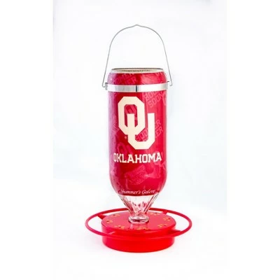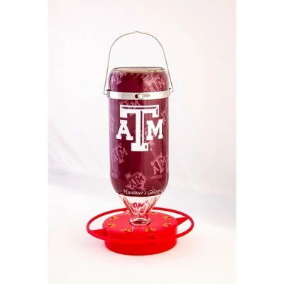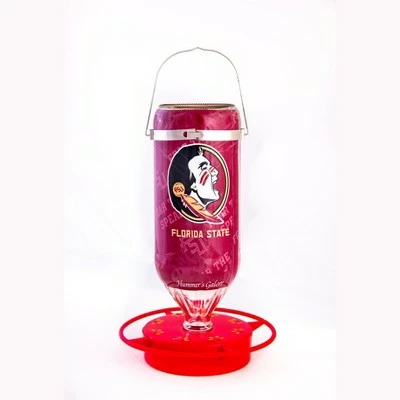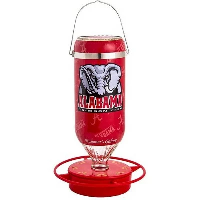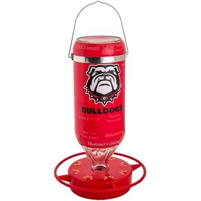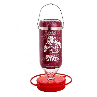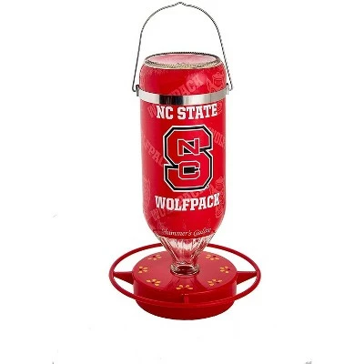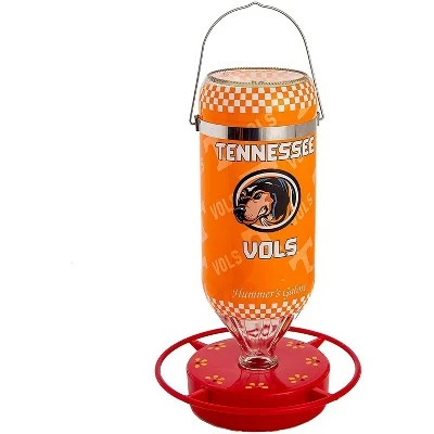 Each 32 oz hanging glass feeder comes exquisitely designed with aesthetics and functionality in mind. These feeders boast a bright and vibrant non-toxic red base with eight feeding stations and a safety perch 1″ from the inside ring to keep hummingbirds coming back for more. Easy to clean and refill with the snap-apart base and convenient window viewing strip to check the nectar level. Made in the USA, these feeders are crafted with high quality materials. The innovative UV ink protection on the designer graphics and red base keep colors from fading and help delay build up, making these feeders long-lasting and easy to maintain. Share your school pride with the neighborhood with these stylish, officially licensed college sports team feeders.