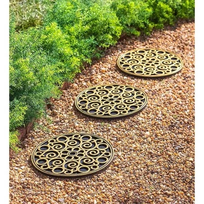 These easy-to-use Recycled Rubber Stepping Stones, Set of 3 look like metal thanks to a metallic finish on the floral and scrollwork designs. The recycled rubber stones are an eco-friendly and long-lasting solution for your garden. Use several sets of three to create a path. You can also use them as accents in a flower bed or at a muddy stair landing to reduce slippage. Scrollwork stones have a golden metallic design; floral have a deep bronze finish design. Both styles have a black background.