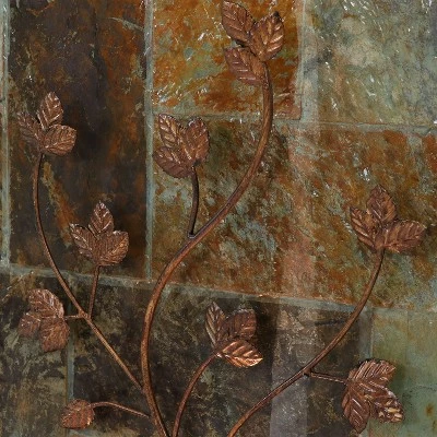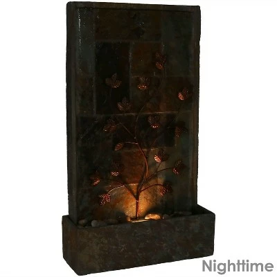 Capture the beauty and grace of nature with this elegant outdoor fountain. Made from durable and stylish slate with a resin coating, this fountain features a beautifully detailed copper-finished vine detail. Water spills gracefully down the wall of the fountain producing a subtle yet soothing sound before collecting in the bottom basin where it circulates through the fountain. Plus, it features a convenient spotlight at the base of the fountain to illuminate your fountain after the sun sets. No plumbing is required. Simply plug the fountain into a standard outdoor electrical outlet. Images include product in nighttime environment.
