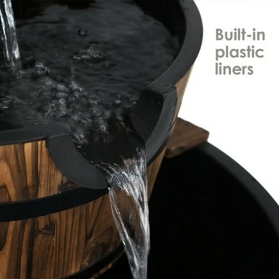 - Rustic wooden barrel fountain with two tiers