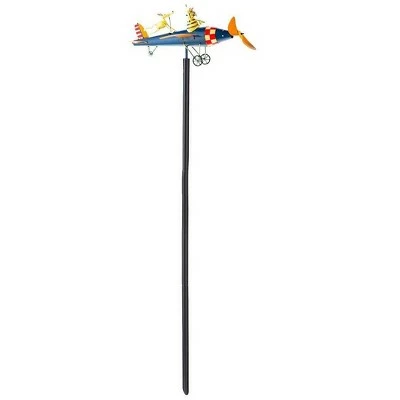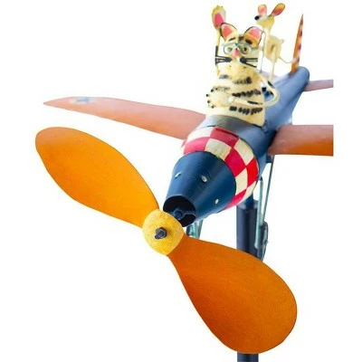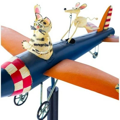 Fasten your seatbelts for fun when you add this Metal Cat and Mouse Airplane Whirligig to your landscape. Crafted from metal, this fantastical flying machine has a brave kitty at the controls while his pal the mouse hangs on for dear life. When the wind turns the propeller, gears cause the cat to wave and the mouse to flap about in the breeze. This kinetic garden decoration will catch eyes for sure, sitting atop it’s 3-piece, 47″ tall post. The powder-coated finish ensures years of smiles from the friendly skies.
