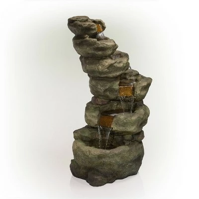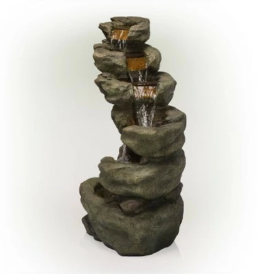 - DURABLE LAWN STATUE: Constructed from durable polystone and fiberglass with a natural stone and aged look, the waterfall fountain is weatherproof, rust-resistant, and resilient