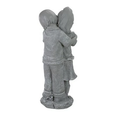 This adorable little boy hugging this girl would be a great addition to your outdoor living space! Ready to be part of your outdoor activities, the little girl looks on with anticipation while the little boy hugs her. This would go great watching over your fountain or pond or place in your flowers! Features: Gray polyresin boy and girl statueBoy hugging the girl from behindLittle girl is wearing a shirt, skirt, and bootsLittle boy is wearing a shirt, pants, and shoesThey are standing on a base resembling a round rockCrafted from quality polystone for years of enjoymentDimensions: 19.5″H x 8.25″W x 5.75″DMaterial(s): polystone/resin mix