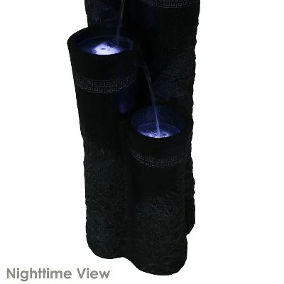 Add an accent to the front door or patio with this attractive outdoor fountain. Each tier features a Greek key design pattern at the top for a touch of embellishment. This fountain also features bright white LED lights in the lower three tiers, so this fountain can be enjoyed at night. An included electric submersible pump recirculates the water, allowing for a continuous flow of water through the fountain. Plus, this fountain does not require any plumbing for installation. Images include product in nighttime environment.
