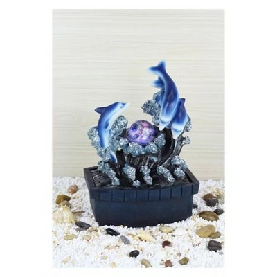 In fengshui water brings good fortune and peace to your life. Water is our life force that is why we like to be near water. When we hear water running we feel less stress. The sound from these waterfalls are soft and soothing to help you relax after a stressful day. These waterfalls are made from a lightweight polyresin so they are easy to move. This table fountain features 3 playful dolphins swimming together in the splashing sea waves. Creates a soft and soothing sensation. Assembly required. Use distilled water when filling.